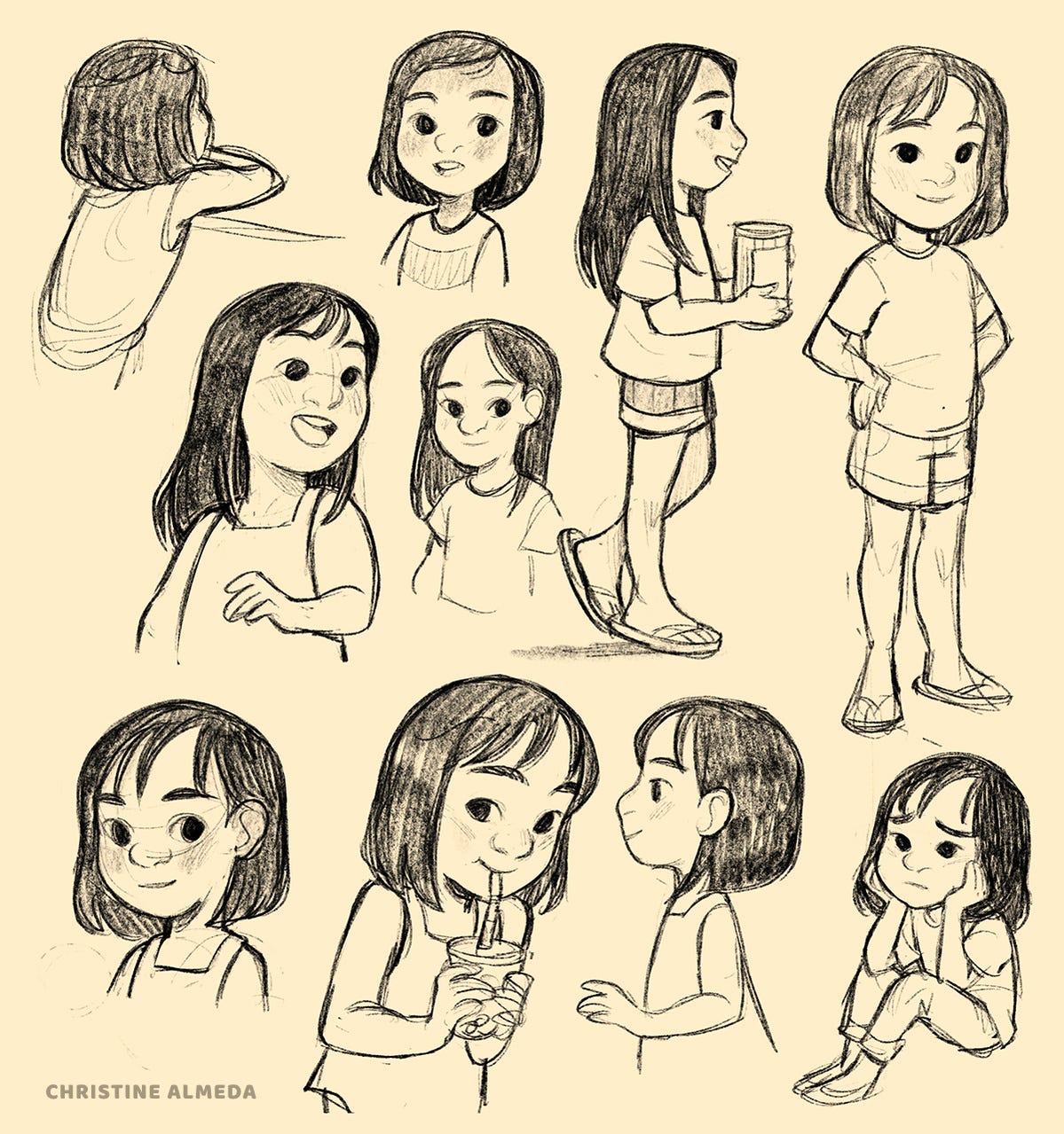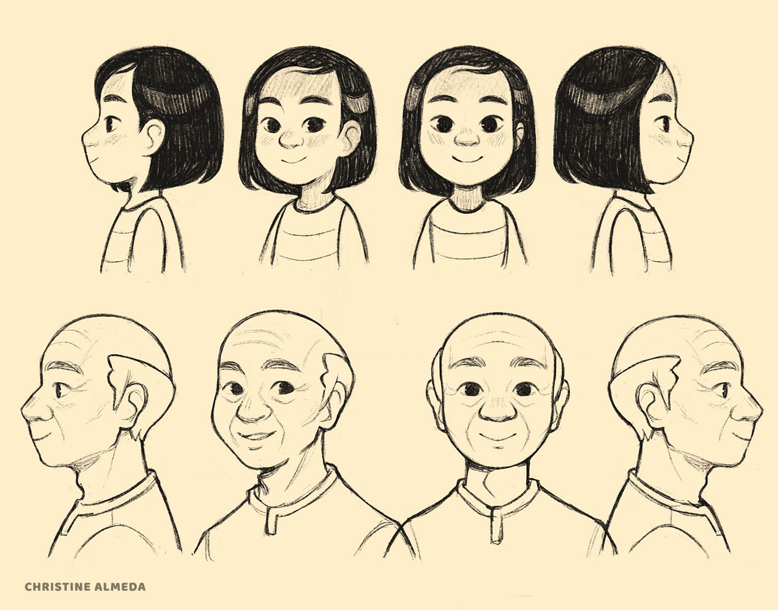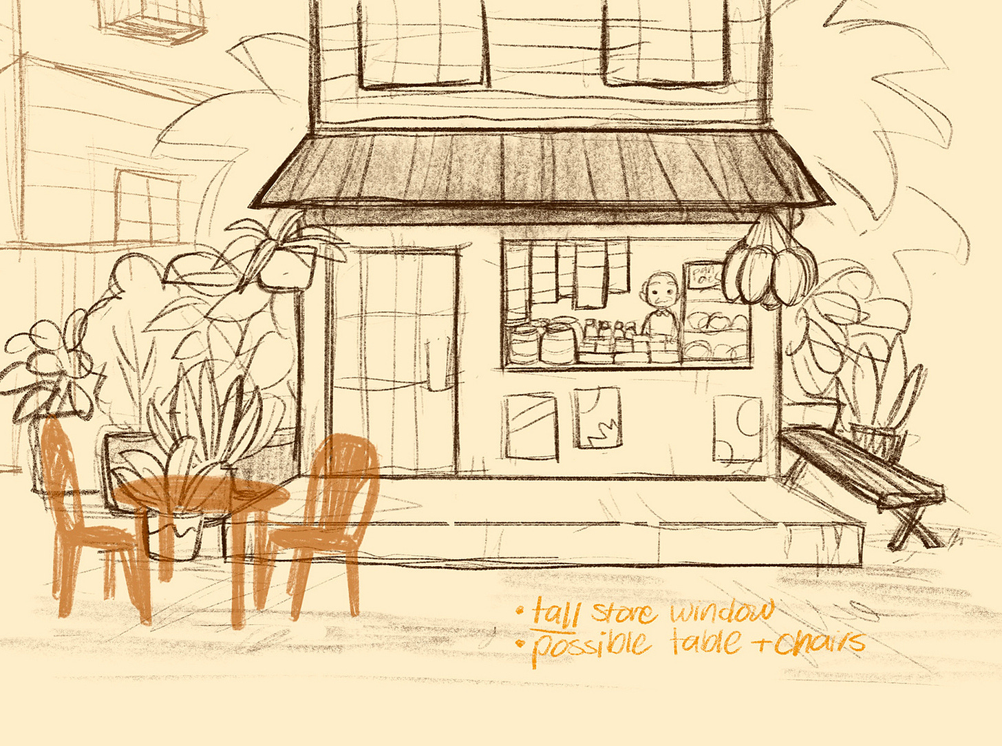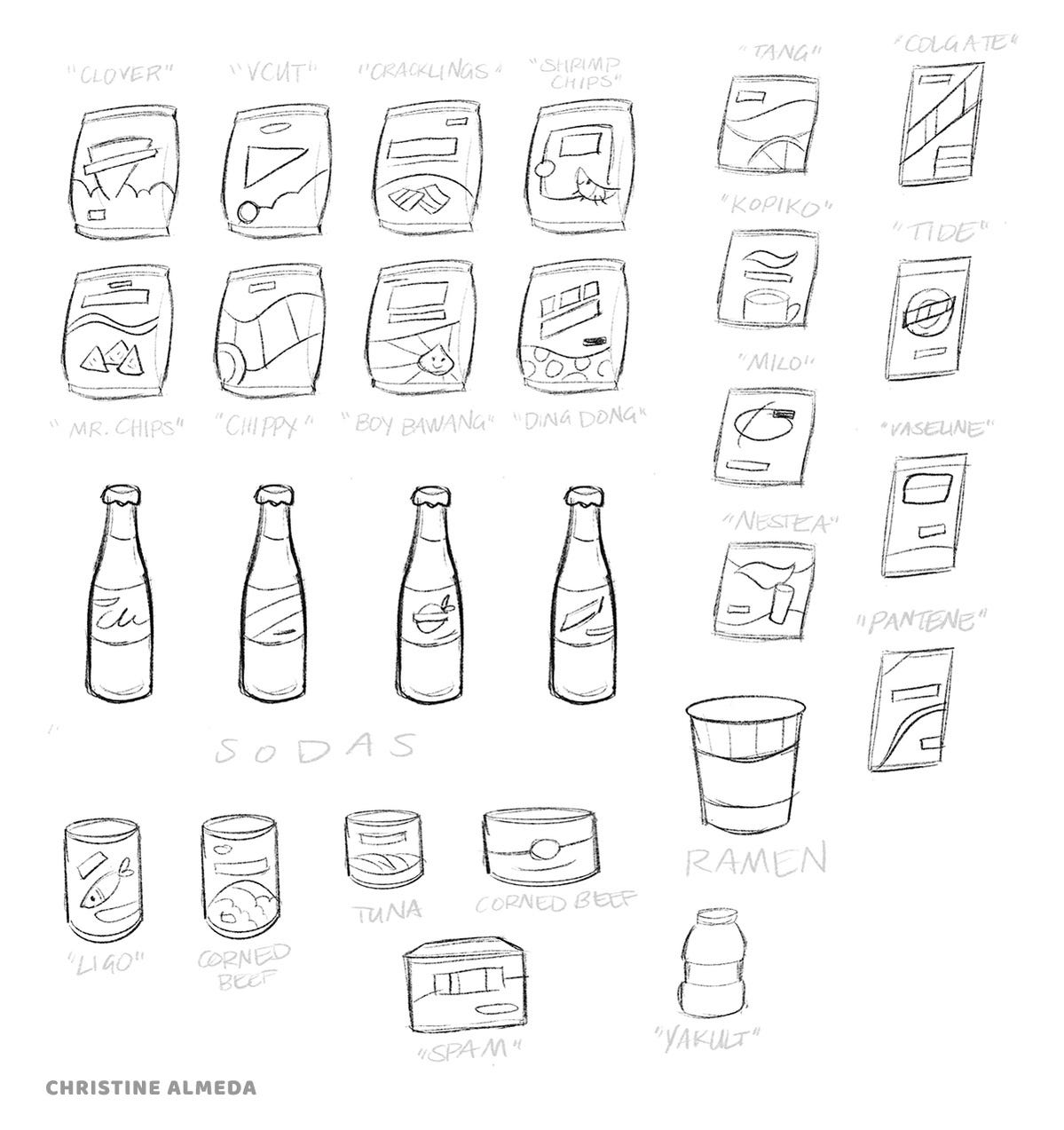 Every project starts with research and gathering reference photos. These help inform and give life to character sketches. I took note of the hot weather in the Philippines, what the people there would wear, and the playful energy when visiting sari-sari stores.